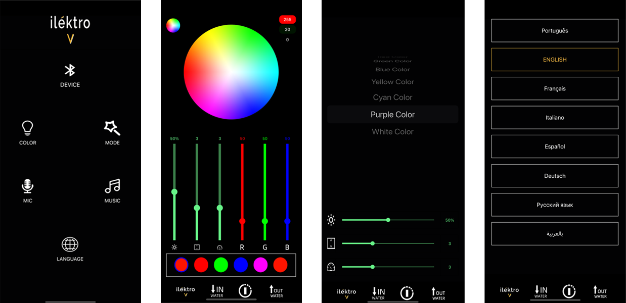 Control Bluetooth lighting, brightness, speed, and water spray size through the app